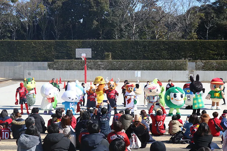 しかおファミリー、ホームタウン・フレンドリータウン、パートナー企業のマスコットが集結し、勝利に向けて応援します🎈